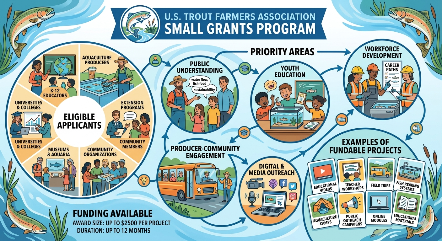 The U.S. Trout Farmers Association (USTFA) is pleased to announce a Small Grants Program to support education and outreach related to U.S. aquaculture. The goal of this program is to increase awareness and understanding of fish farming, support workforce development, and provide science-based educational resources about the role of aquaculture – especially trout farming – in sustainable food production.